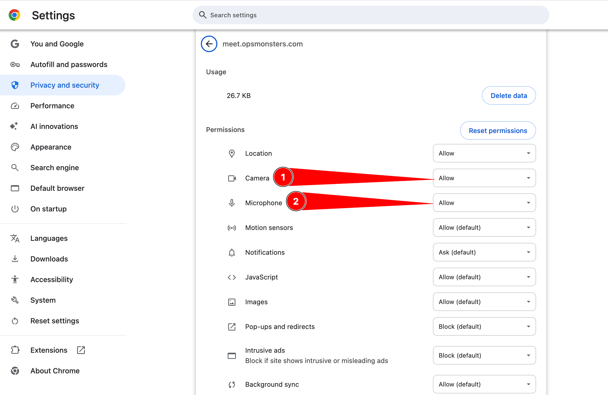 Under ‘Privacy and Security,’ click on ‘Site Settings.’ Then, find and click on ‘Microphone’ and give the necessary permissions.”